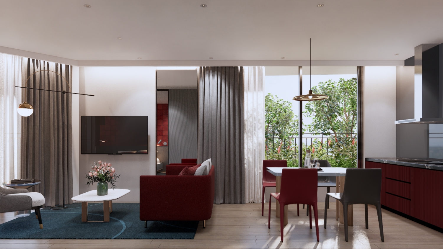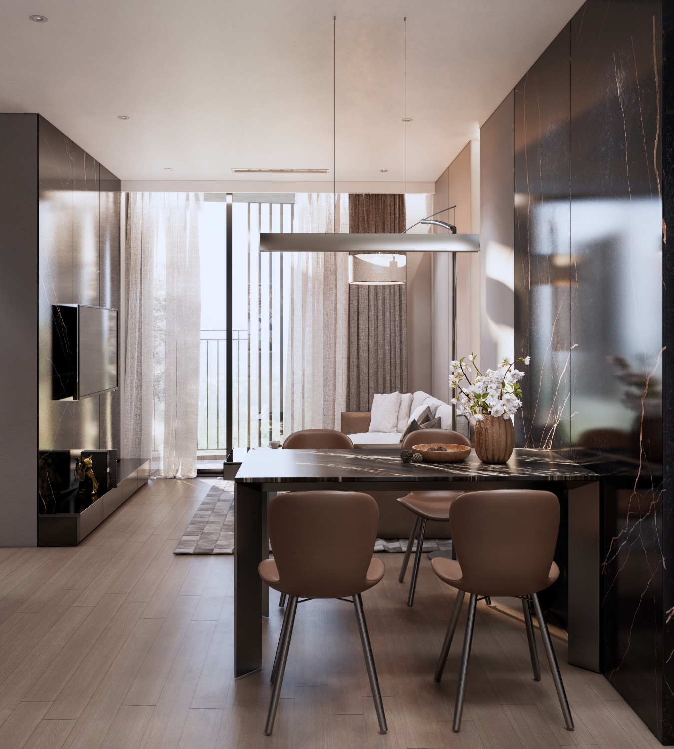 Taiyo Apartment has a strong architectural shape inspired by the cubic shape of the rocky mountains. The angles that are changed layer by layer in combination with the dark tones will create an impressive visual effect. The interior for each room class of Taiyo Apartment is designed in a storytelling way, depicting the lifestyle journey of a “man” as a “real gentleman”. This highlight will be the attraction for the project as it increases the maximum experience for guests to stay.