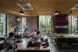 The 2nd floor is designed for office space work, management, and board of directors. Using glass walls throughout the factory promotes workers directly connecting with each other and increased interactions. The 1st floor is a creative space for displaying samples, congregating, and seating areas. Situated between gardens allows an uplifting and rehabilitating feeling for everyone. This is also appreciated by customers who enjoy seeing the production and creativity of the company and its products.