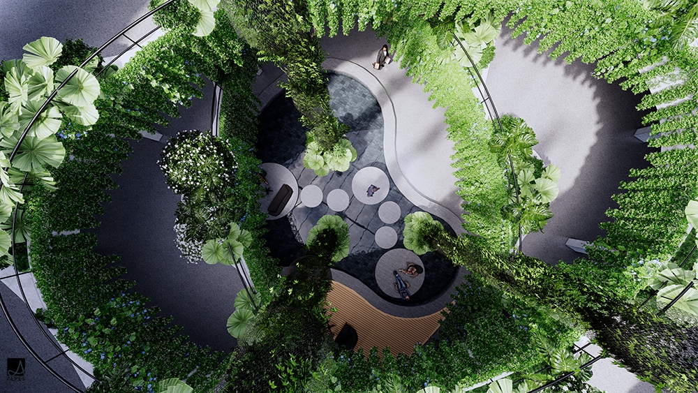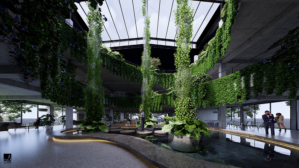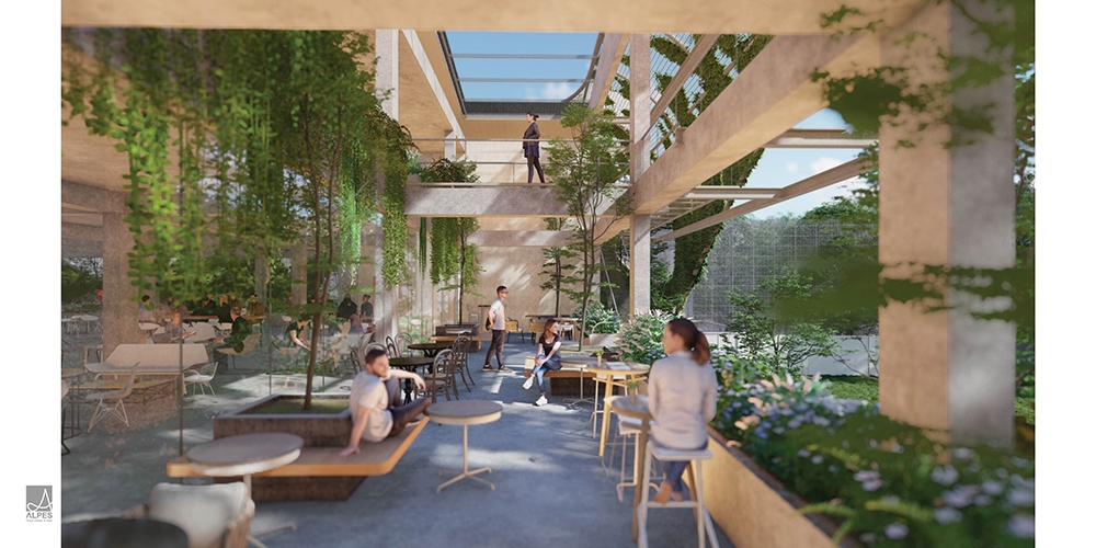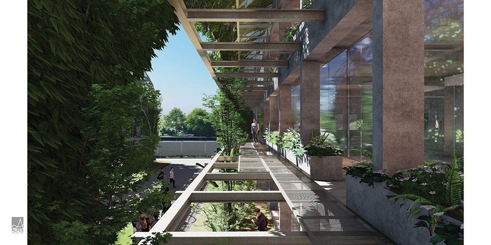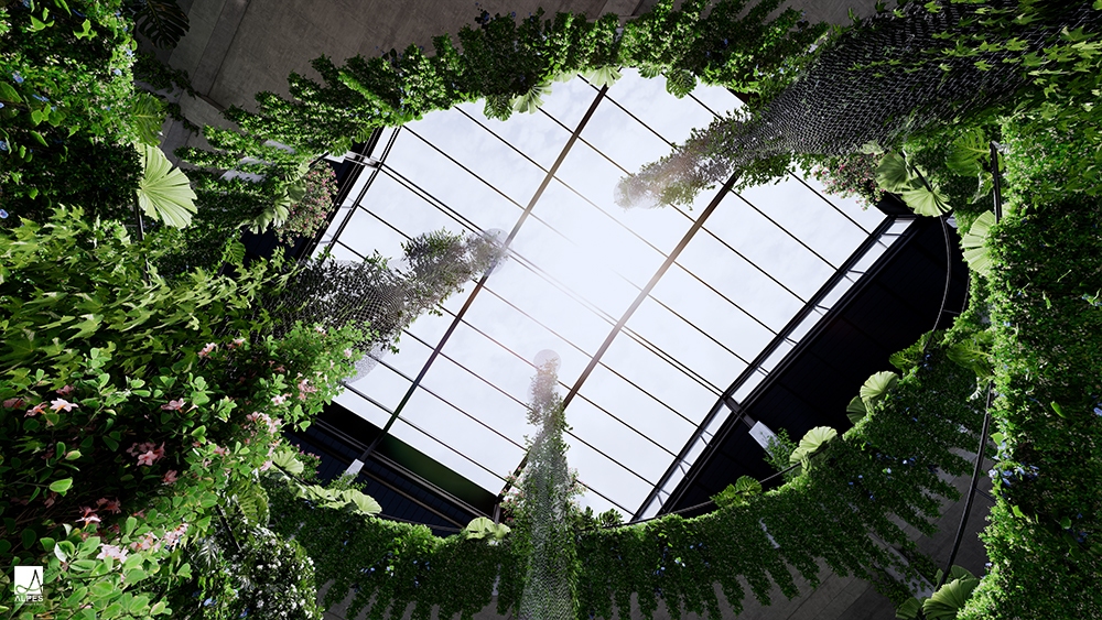 The emphasis inside the building comes from the void designed mainly right in the middle of the dining house. The vegetarian carpets, the aquarium surface on the first floor, and the green “coat” cover the building allowing workers to feel as if they are resting in a tropical garden resort. In addition, the green coat also protects the building from the heat radiation of the hot sun.