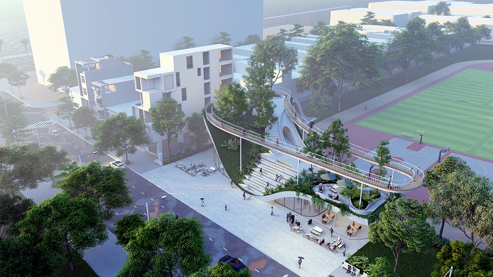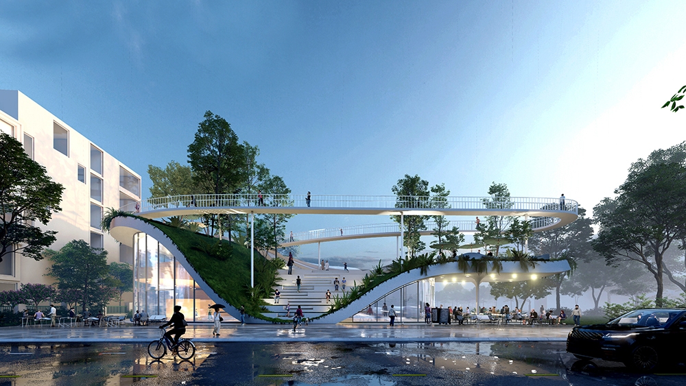 The architectural line of the building itself carried the artistic need. "Wings Art" is inspired by the image of a seabird, with the emphasis of the work being the concrete frame structure that flexes the shape, combining vegetative carpets and a high walkway that creates a characteristic architectural shape for the work. It is hoped that the work will bring artistic inspiration, become an attractive destination, and contribute to green community space for the city of Da Nang.