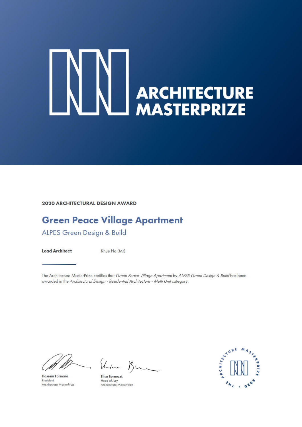 Ho Khue Architects (ALPES) won the Architecture Masterprize 2020 (US) with project: The Green Peace Village Apartment