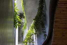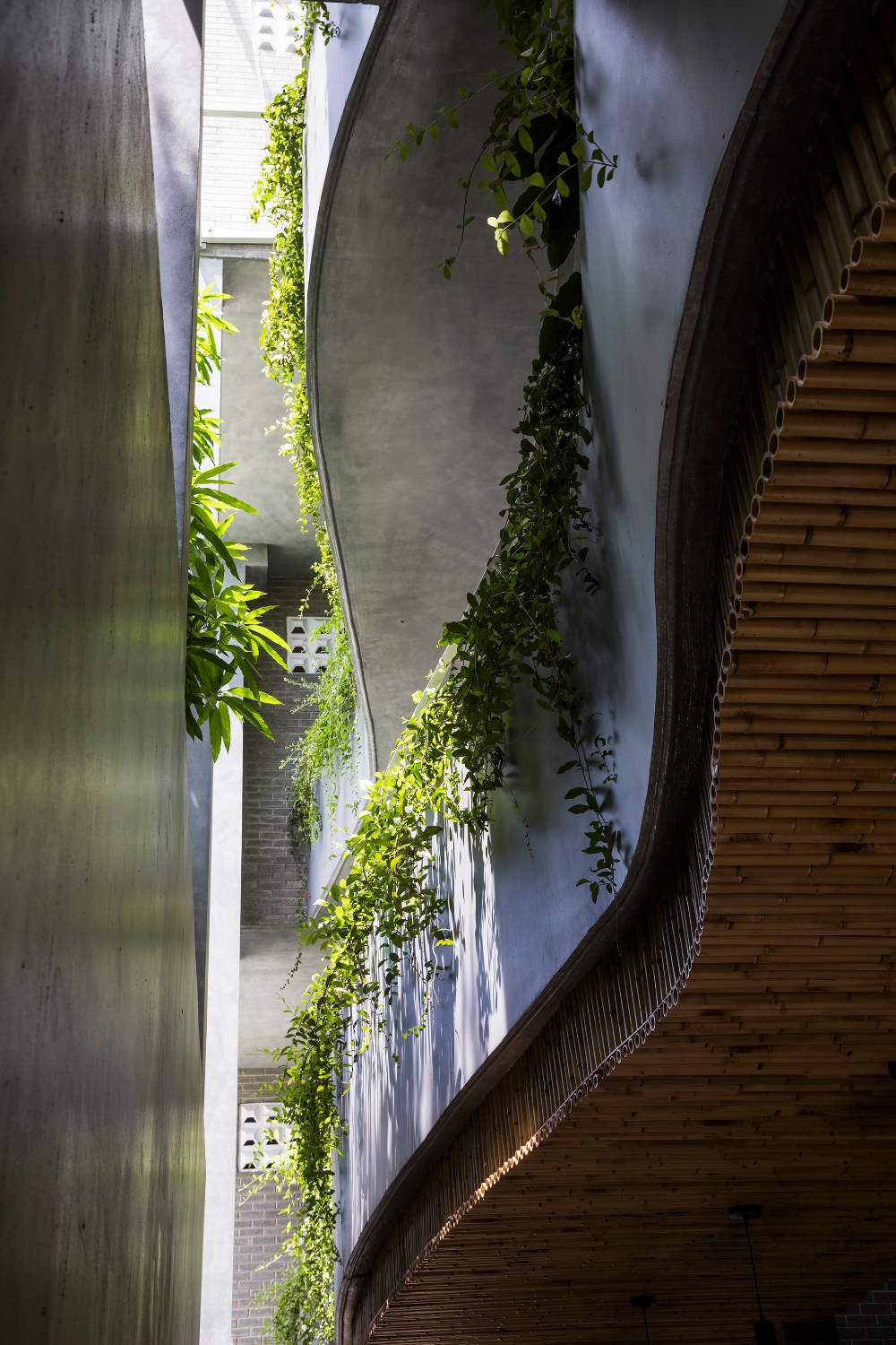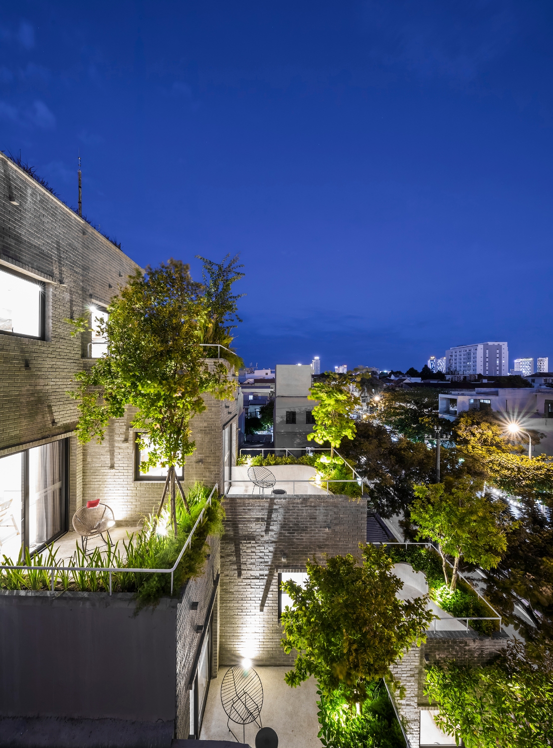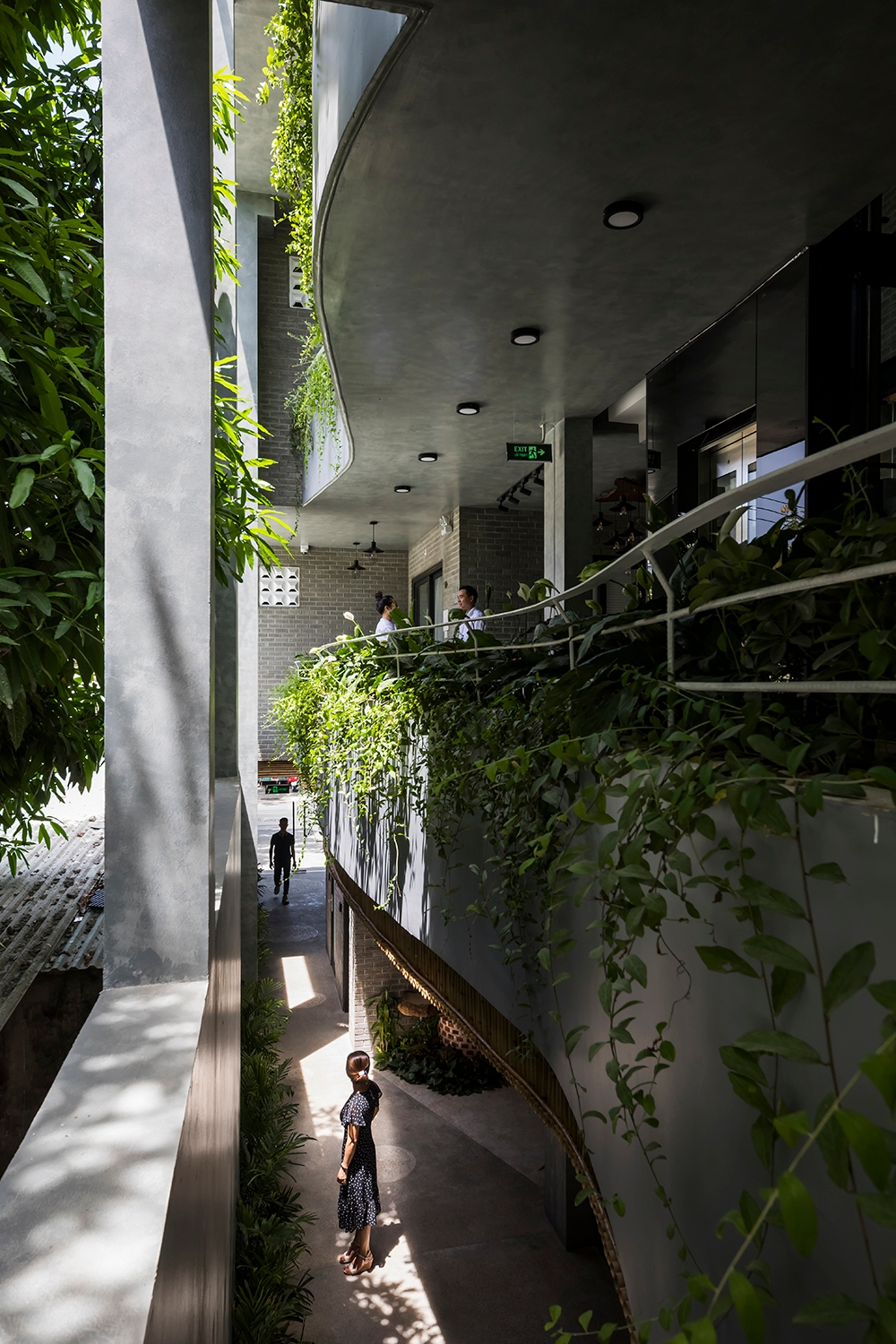 The site volume was very rigid and needed breaks and free spaces to solve the problem of lighting and natural ventilation the architect has designed a solution to distribute the construction area to create two large, high floor spaces. 1st-4th floor with a central atrium for air circulation and sufficient natural light and at the same time hold a large variety of green spaces with many layers of plants making it more biophilic. In order to highlight the urban space, and create green spaces for each apartment, the concept was originated from the idea of terraced fields, a natural landscape of agriculture in the Northwest of Vietnam. Each 3m wide module setbacks itself creating an alternated terraces connecting space for the users. Each apartment has 1-2 gardens. This design connects users with each other and the gardens contribute in the urban green area within the city.