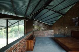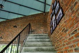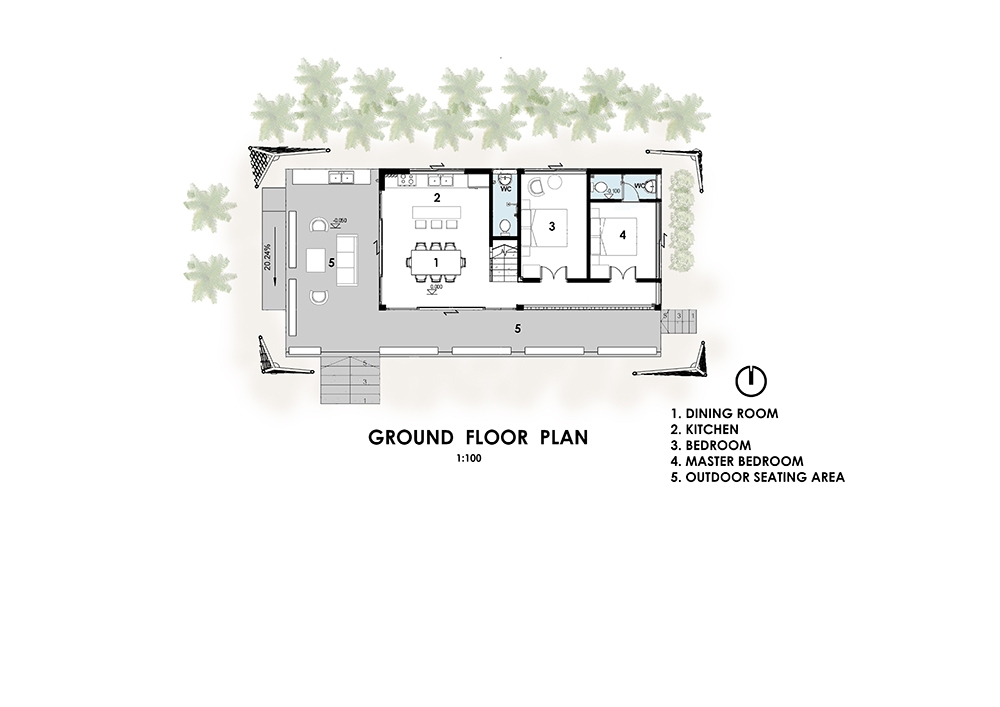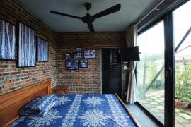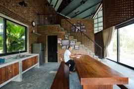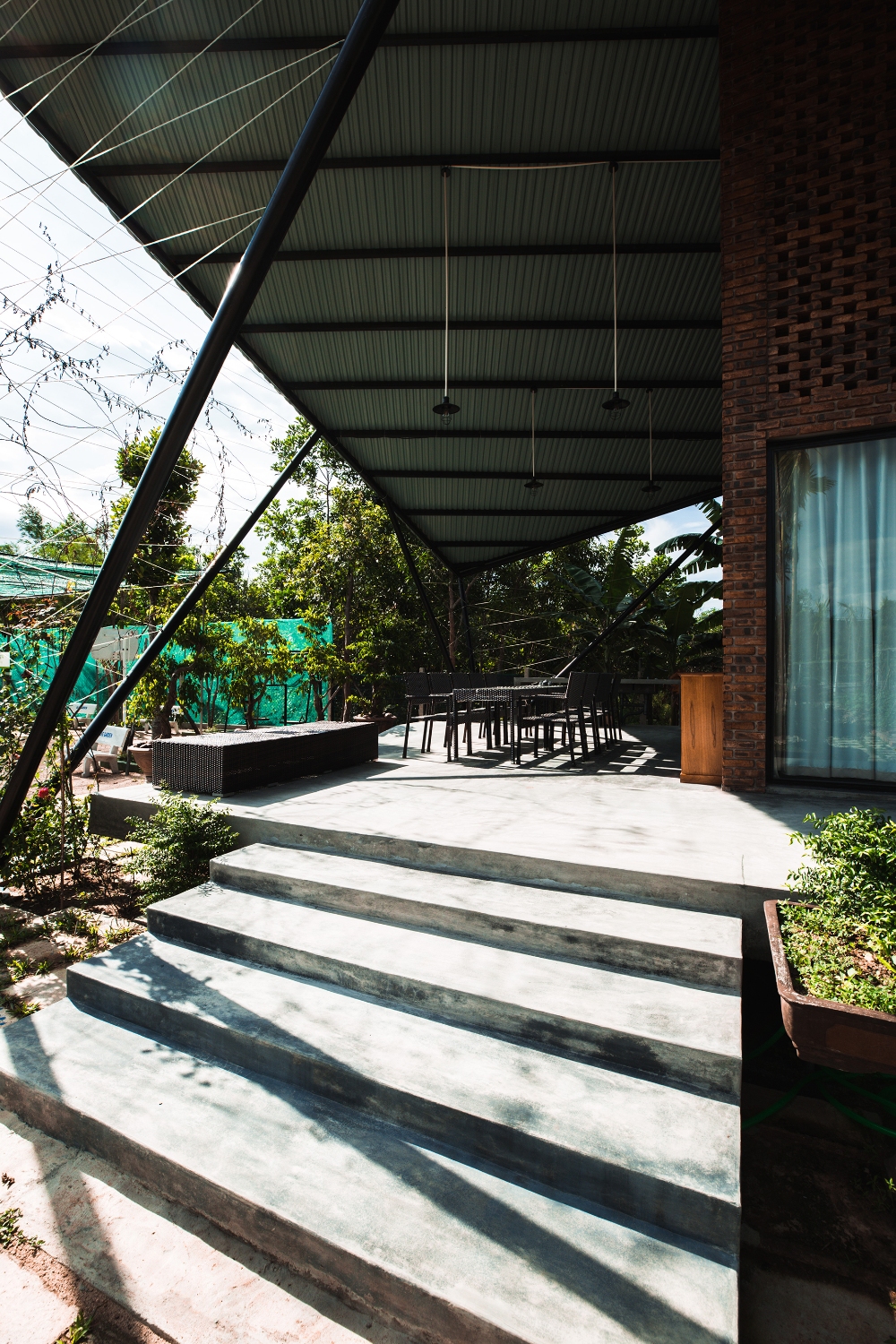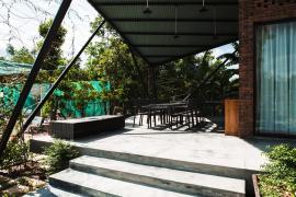 The project has a site area of about 1,500 sq.m with a total construction area of 195 sq.m with a ground floor and a mezzanine floor. The ground floor is divided into 3 parts – there is an outside seating area, a kitchen with a dining area, and two bedrooms. The mezzanine floor area is used as a family room. The children of the elderly couple visit them on weekends. So the family room plays an important role in bringing all the family together and closer. The partition of this project is a combination of brick walls and glass doors.