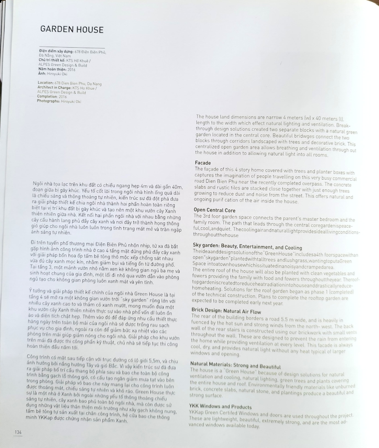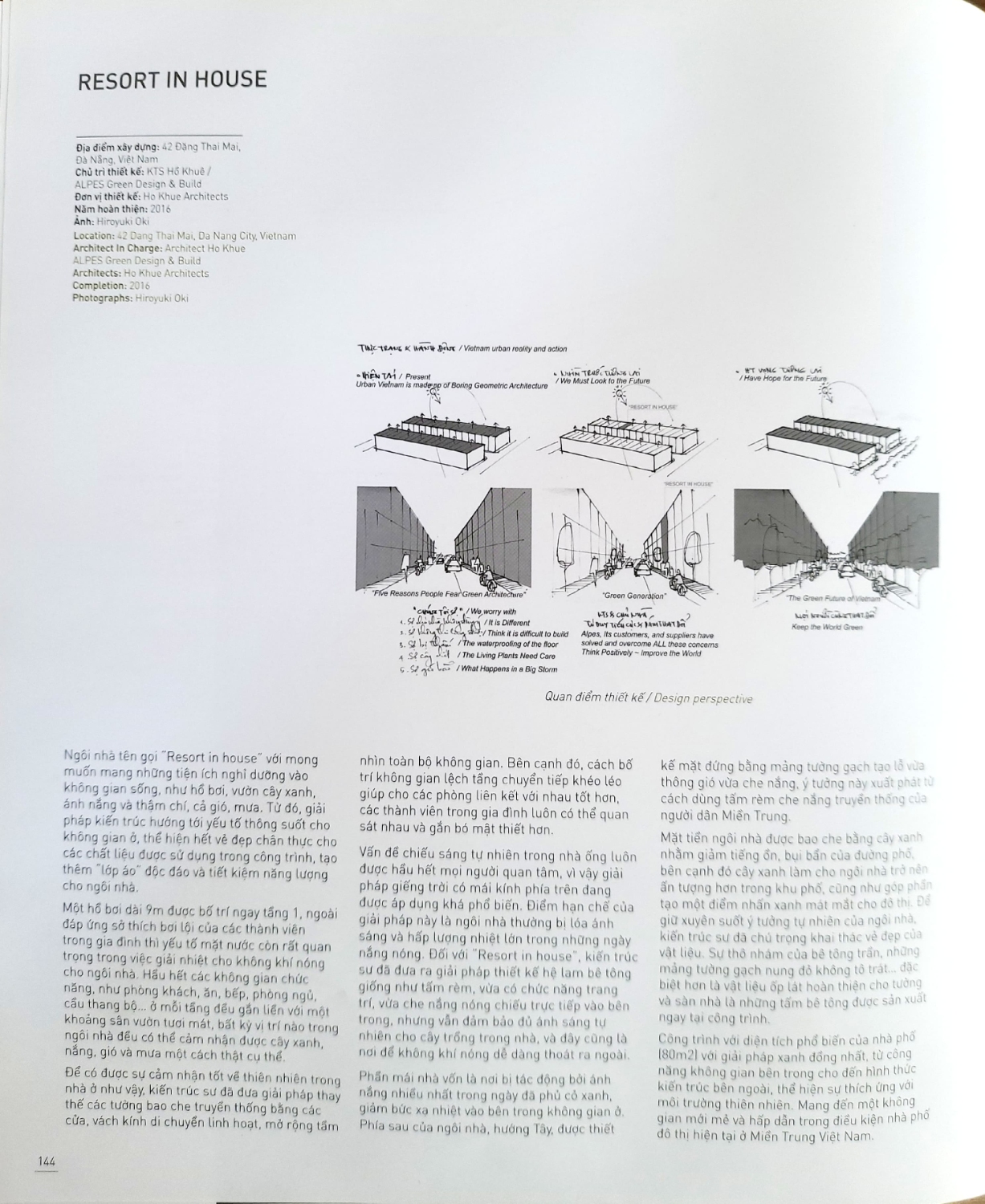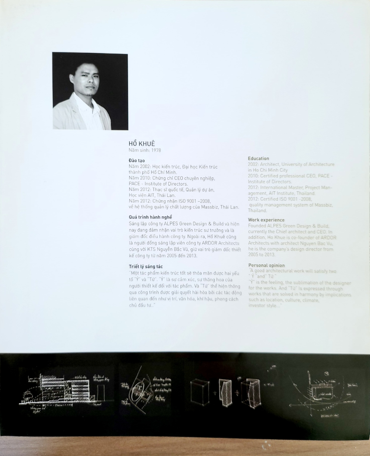 KTS Hồ Khuê xuất hiện trong ấn phẩm 21 Kiến trúc sư xanh đương đại Việt Nam với 2 tác phẩm: Garden House và Resort in House. 2 công trình này đánh dấu bước đi đầu tiên của KTS Hồ Khuê trong việc đưa những yếu tố thiên nhiên vào trong thiết kế của mình. Ở Garden House, một khu vườn trời giúp làm dịu đi hình thái khí hậu nhiệt đới, kết nối các không gian trong nhà tạo nên sự hòa hợp ấm cúng cần có của một tổ ấm. Còn Resort in House, những yếu tố thiên nhiên như mặt nước, nắng, gió, mưa, tất cả đều được kiến trúc sư khéo léo hòa hợp vào ngôi nhà, tạo nên không gian tựa như một khu nghỉ dưỡng trong chính nơi ở của gia chủ.